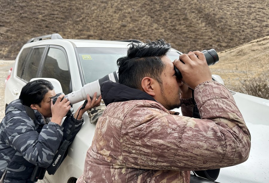 Gecho Chopee (R) and Tsering Nima patrol at the Angsai Canyon in Angsai Township of Zaduo County, Yushu Tibetan Autonomous Prefecture, northwest China's Qinghai Province, Feb. 21, 2023. (Xinhua/Fei Maohua)