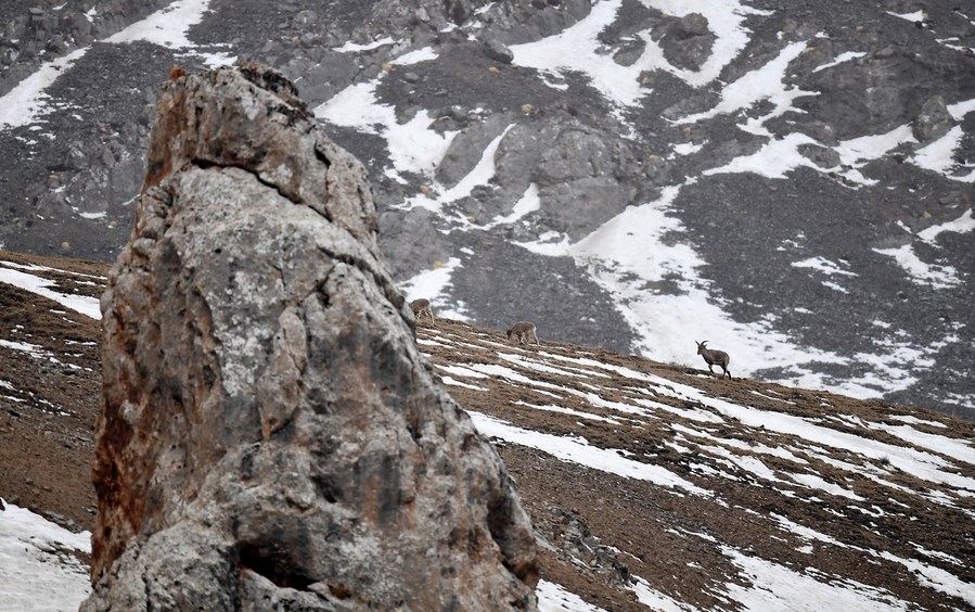 This photo taken on Feb. 21, 2023 shows a group of blue sheep at Angsai Canyon in Angsai Township of Zaduo County, Yushu Tibetan Autonomous Prefecture, northwest China's Qinghai Province. (Xinhua/Zhang Hongxiang)