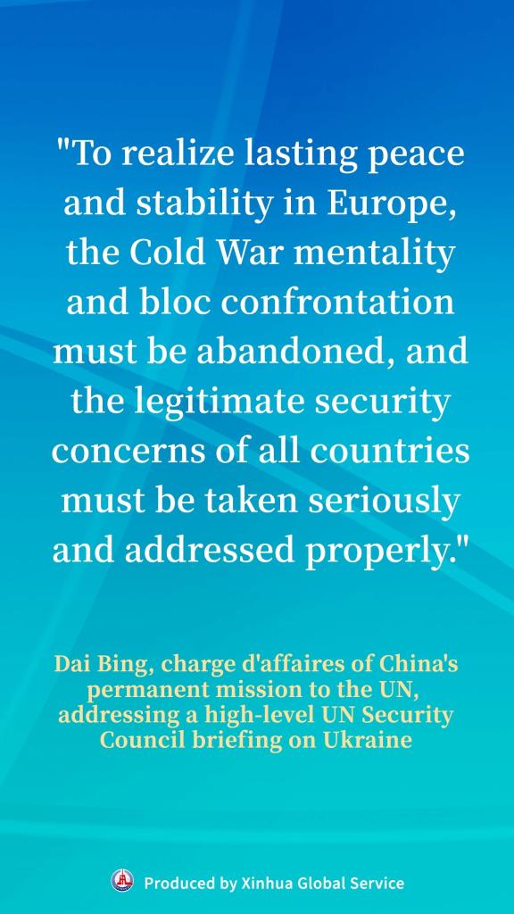Russia, Ukraine and European countries are neighbors that cannot be physically moved away. To realize lasting peace and stability in Europe, the Cold War mentality and bloc confrontation must be abandoned, and the legitimate security concerns of all countries must be taken seriously and addressed properly, so as to build a balanced, effective and sustainable regional security architecture, said Dai.