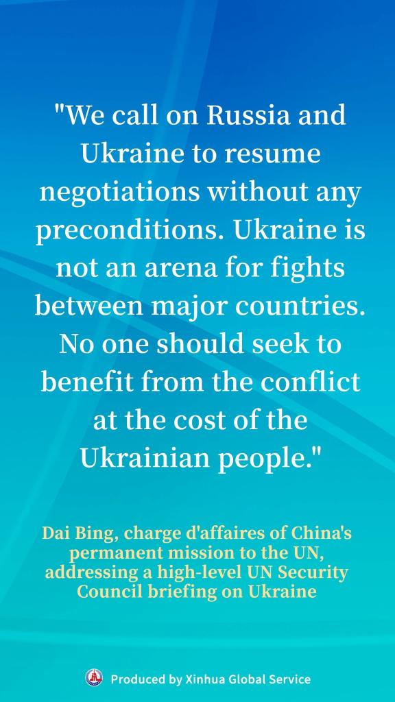 "We call on Russia and Ukraine to resume negotiations without any preconditions," said Dai Bing, charge d'affaires of China's permanent mission to the United Nations, while addressing a high-level UN Security Council briefing on Ukraine.
