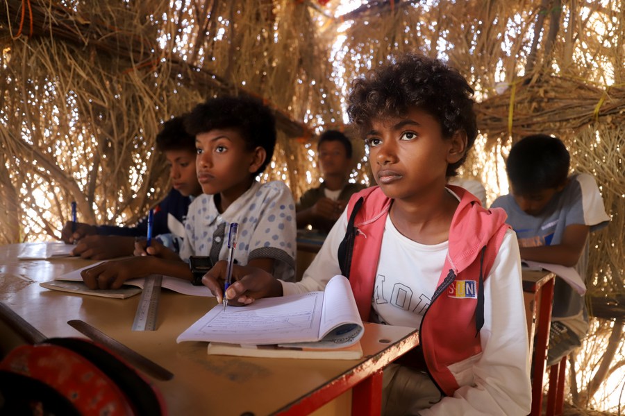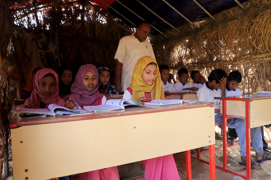 Students study inside a "straw cottage" classroom at a school in Abs District, Hajjah Province, northern Yemen, Feb. 23, 2023. (Photo by Mohammed Al-Wafi)