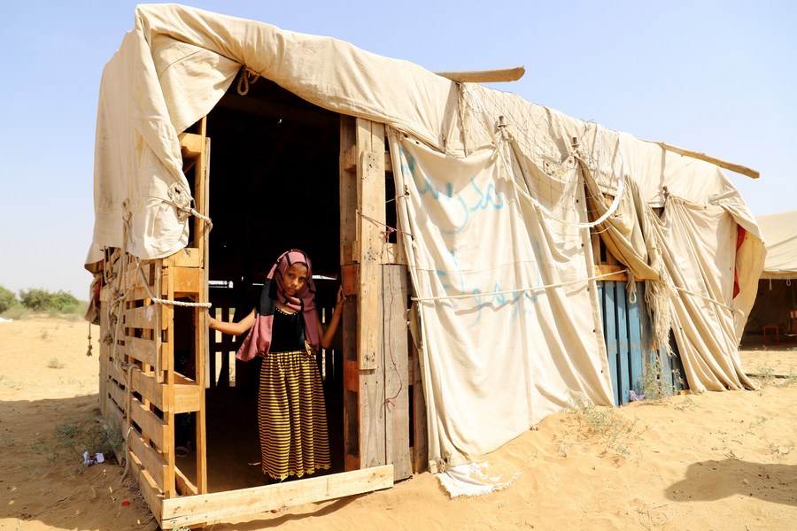 Schoolgirls stand at the door of a "straw cottage" classroom at a school in Abs District, Hajjah Province, northern Yemen, Feb. 23, 2023. (Photo by Mohammed Al-Wafi)■