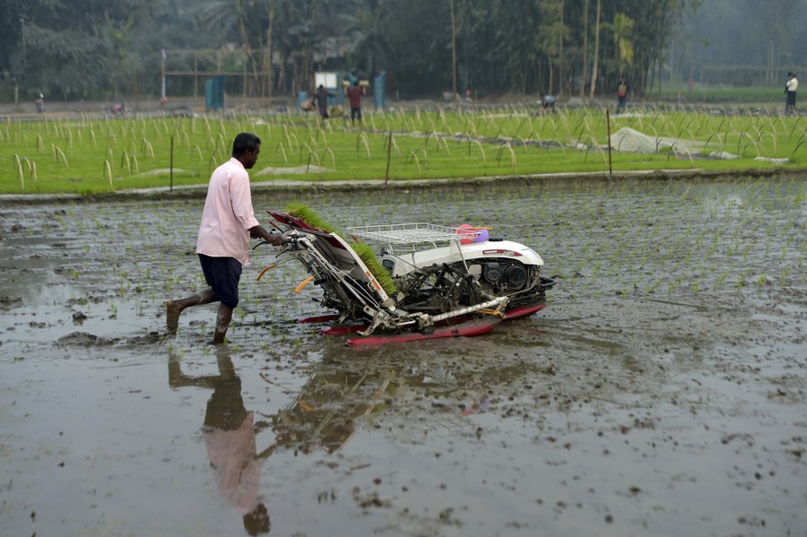 A farmer uses a machine to plant rice seedlings in a field in Nilphamari, Bangladesh, Feb. 9, 2023. (Xinhua)