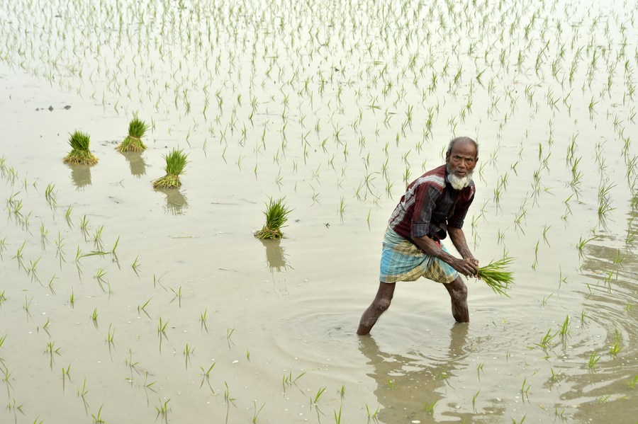 A farmer plants rice seedlings in a field in Nilphamari, Bangladesh, Feb. 9, 2023. (Xinhua)