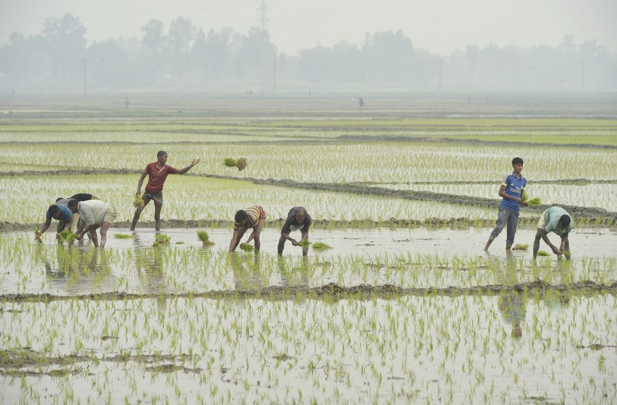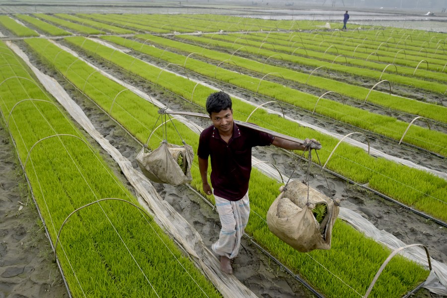 A farmer transports rice seedlings in a field in Nilphamari, Bangladesh, Feb. 9, 2023. (Xinhua)