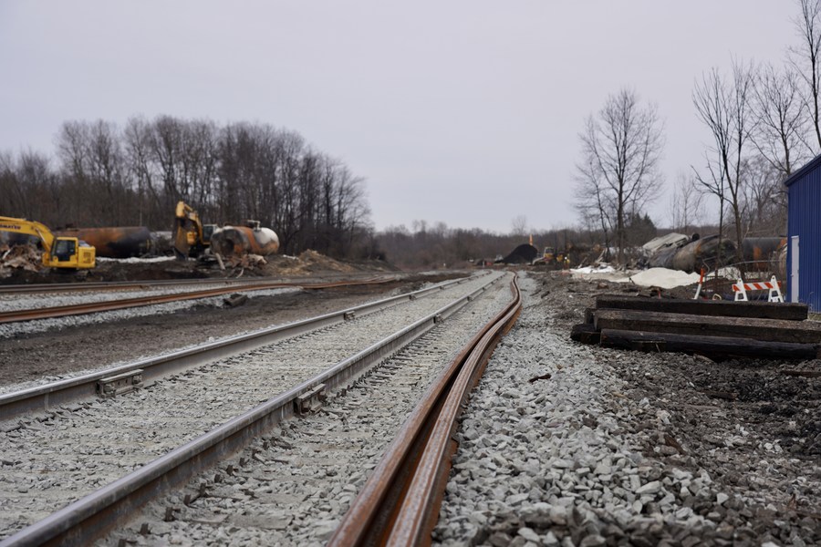 Twisted rails are seen on the site of the Feb. 3 derailment on the outskirts of the village of East Palestine, Ohio, the United States, on Feb. 14, 2023. (Photo by Phil Zhang/Xinhua)