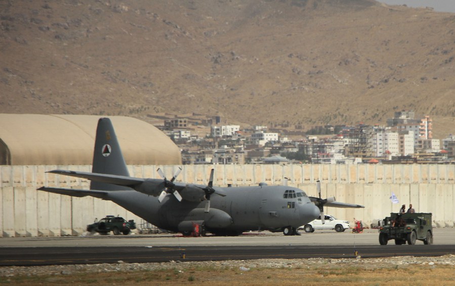 Photo taken on Aug. 31, 2021 shows a military plane at Kabul airport in Kabul, capital of Afghanistan. (Photo by Saifurahman Safi/Xinhua)