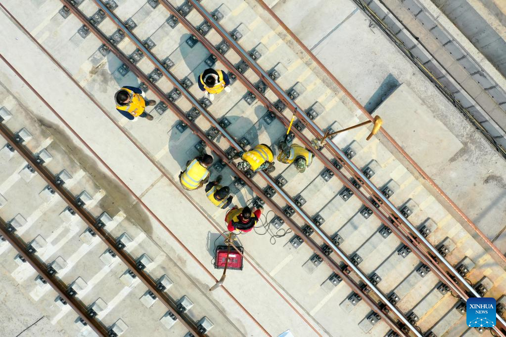 This aerial photo taken on Feb. 27, 2023 shows technicians conducting fine adjustment work of rail tracks near the Duyun East Railway Station along Guiyang-Nanning high-speed railway in Duyun, southwest China's Guizhou Province. The Guiyang-Nanning high-speed railway, with a maximum speed of 350 km per hour, is expected to go into service in 2023. (Xinhua/Liu Xu)