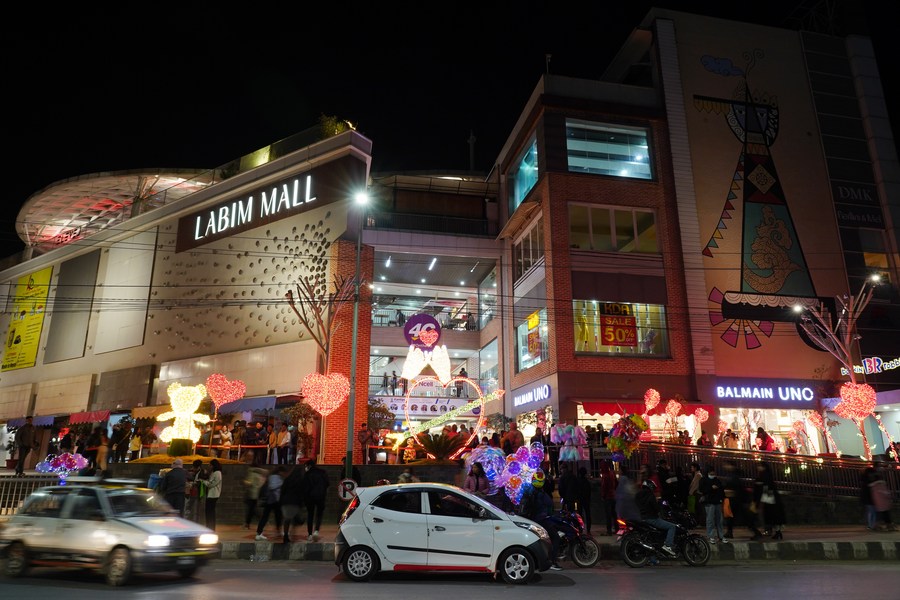 A shopping mall is decorated for Valentine's Day in Lalitpur, Nepal, Feb. 14, 2023. (Photo by Hari Maharjan/Xinhua)