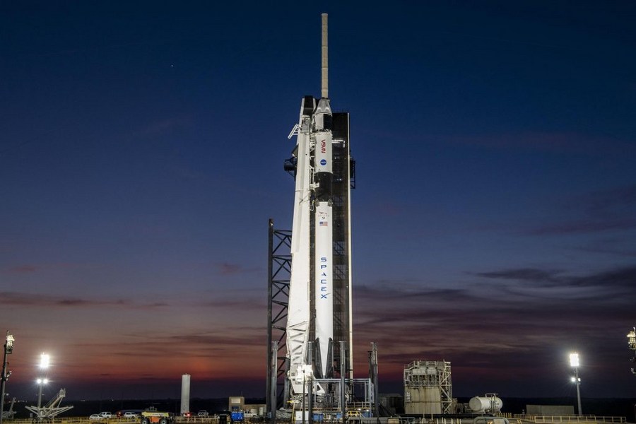 Photo posted on Feb. 27, 2023 shows a SpaceX Falcon 9 rocket carrying Crew Dragon on NASA's SpaceX Crew-6 mission to the International Space Station at the Kennedy Space Center in Florida, the United States. (Photo credit: SpaceX)