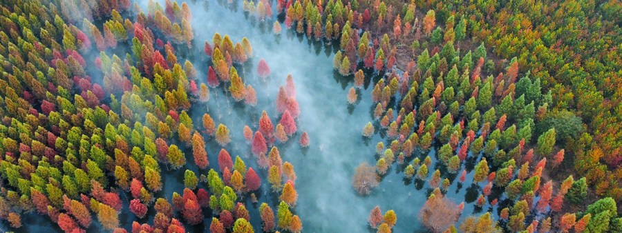 This photo taken on Jan. 5, 2019 shows the wetland of dawn redwood clad in mist in Dianwei Village in Panlong District of Kunming, capital of southwest China's Yunnan Province. (Photo by Fei Chao/Xinhua)