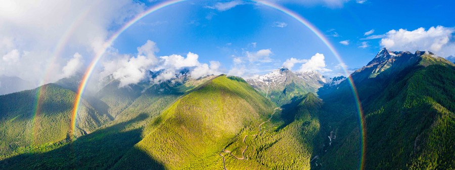 This stitched aerial photo taken on July 6, 2021 shows a rainbow over the road linking counties of Mainling and Medog in Nyingchi, southwest China's Tibet Autonomous Region. (Photo by Dong Zhixiong/Xinhua)