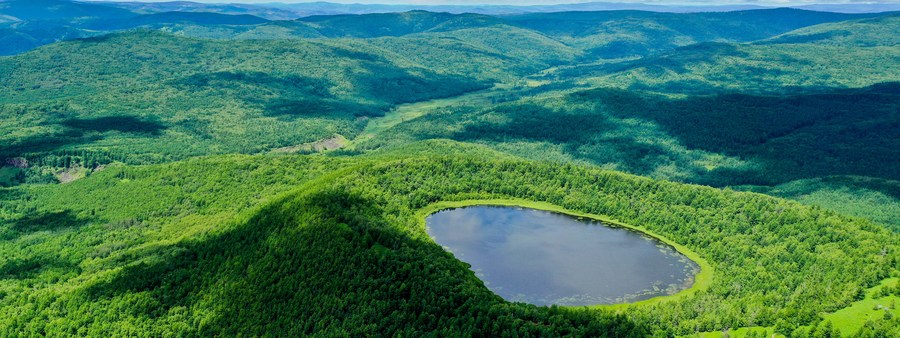 This aerial photo taken on July 14, 2021 shows the Arxan Tianchi (Heavenly Lake) in the Arxan National Forest Park, north China's Inner Mongolia Autonomous Region. (Xinhua/Lian Zhen)