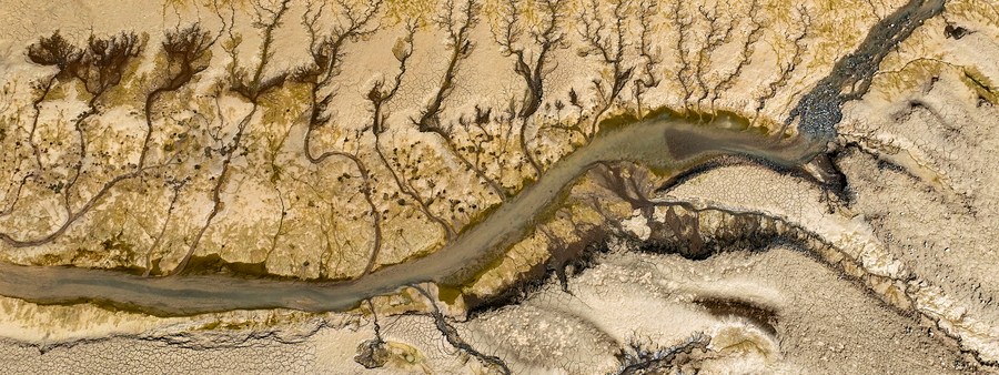 This aerial photo taken on July 9, 2022 shows the riverbed of the Xiaolangdi Reservoir on the Yellow River in Jiyuan City, central China's Henan Province. (Photo by Miao Qiunao/Xinhua)
