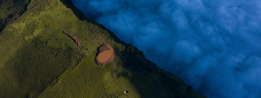 This aerial photo taken on July 7, 2022 shows clouds floating over the Mount Longtou bordering Leibo County and Meigu County, southwest China's Sichuan Province. (Xinhua/Jiang Hongjing)