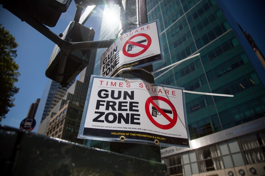 Gun-free zone signages are seen near Times Square in New York, the United States, Sept. 1, 2022. (Photo by Michael Nagle/Xinhua)