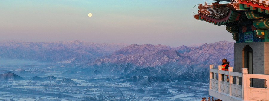 This aerial photo taken on March 19, 2022 shows ranger Song Chen up for work at the watchtower on Mangshan Mountain in Beijing, capital of China. (Xinhua/Li He)