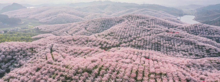 This aerial photo taken on March 16, 2021 shows cherry blossoms at a cherry garden in Huangla Township, Anshun City of southwest China's Guizhou Province. (Xinhua/Liu Xu)
