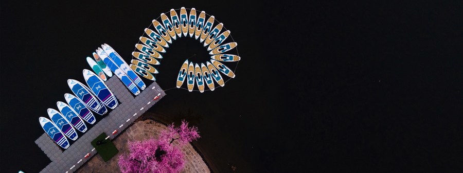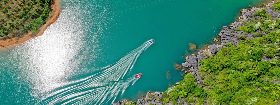 This aerial photo taken on April 21, 2022 shows volunteers patrolling in Lehai reservoir in Shouyan Township, Daoxian County of Yongzhou City, central China's Hunan Province. (Photo by Jiang Keqing/Xinhua)