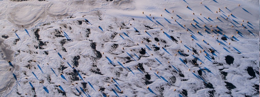 This aerial photo taken on Dec. 31, 2018 shows ruddy shelducks on the frozen Qinghai Lake in northwest China's Qinghai Province. (Xinhua/Wu Gang)