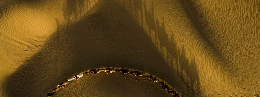 This aerial photo taken on Oct. 26, 2019 shows tourists riding camels to enjoy the desert scenery at Lop Nur People Village in Yuli County, northwest China's Xinjiang Uygur Autonomous Region. (Xinhua/Zhao Ge)