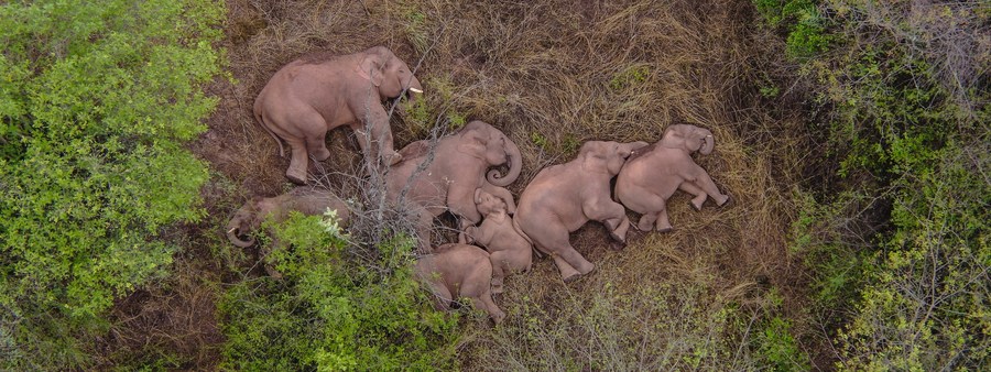 This aerial photo taken on June 7, 2021 shows wild Asian elephants in Jinning District of Kunming, southwest China's Yunnan Province. (Xinhua)