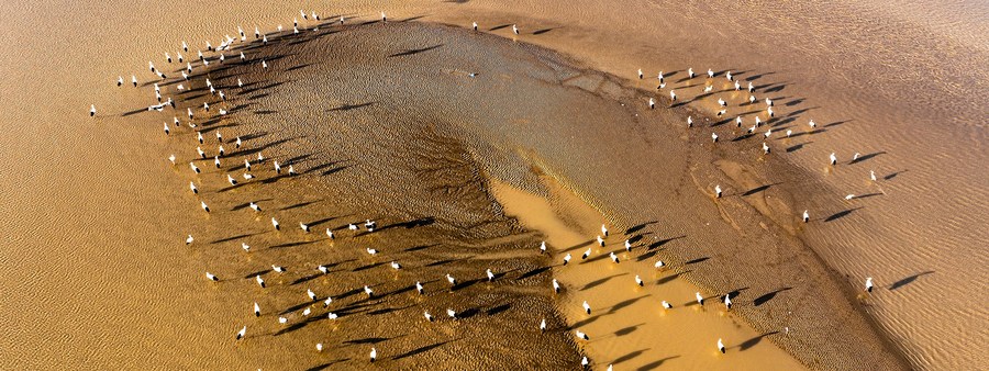 This aerial photo taken on March 2, 2022 shows oriental white storks at the Yellow River Delta National Nature Reserve in east China's Shandong Province. (Photo by Yang Bin/Xinhua)
