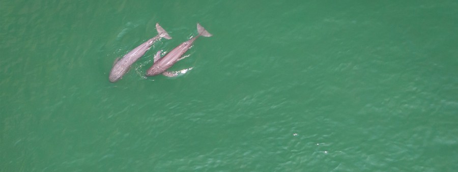 This aerial photo taken on May 11, 2021 shows two Yangtze finless porpoises swimming in the Yichang section of the Yangtze River, central China's Hubei Province. (Xinhua/Xiao Yijiu)■