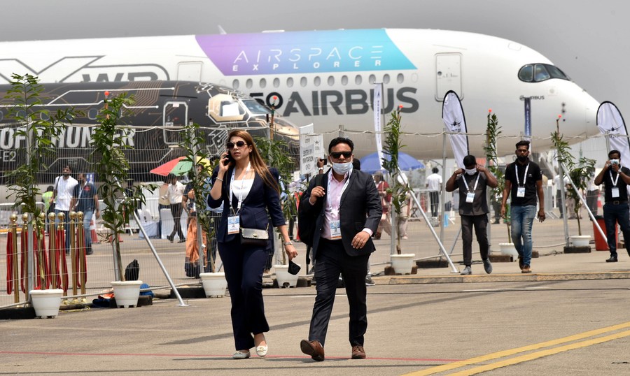 Photo taken on March 24, 2022 shows a view of the aviation show "Wings India 2022" on its first day at Begumpet Airport in Hyderabad, capital of India's Telangana state. (Str/Xinhua)