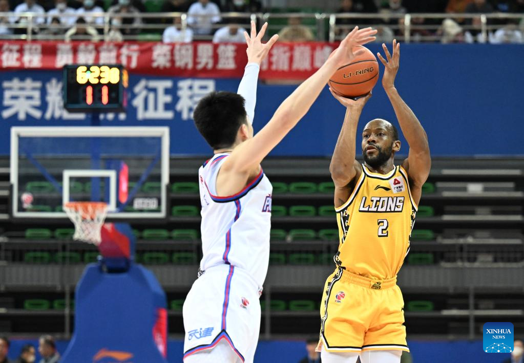 Terry Cummings (R) of Zhejiang Lions shoots during the 29th round match between Tianjin Pioneers and Zhejiang Lions at the 2022-2023 season of the Chinese Basketball Association (CBA) league in north China's Tianjin, March 2, 2023. (Xinhua/Sun Fanyue)