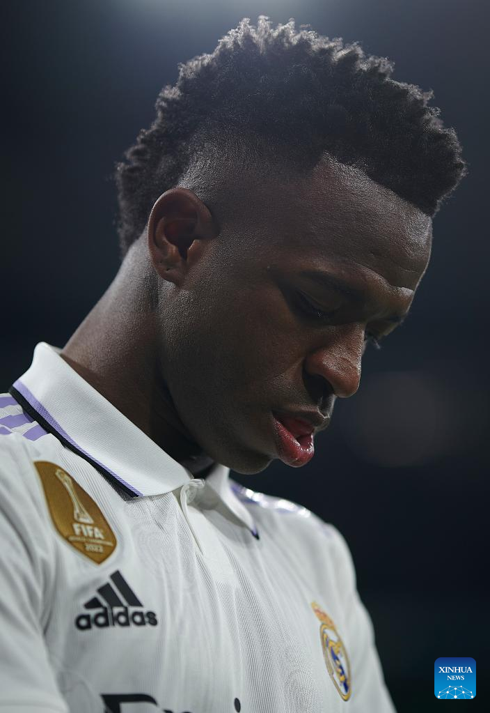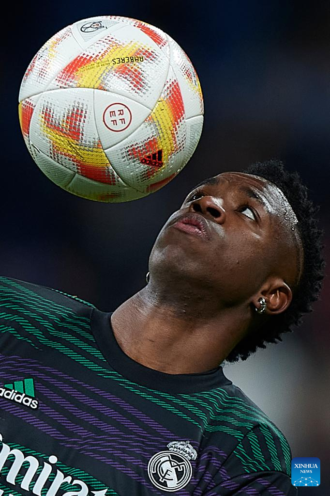Vinicius Jr. of Real Madrid warms up before the Spain's Copa del Rey (King's Cup) semifinal first leg football match between Real Madrid and FC Barcelona in Madrid, Spain, March 2, 2023. (Photo by Pablo Morano/Xinhua)