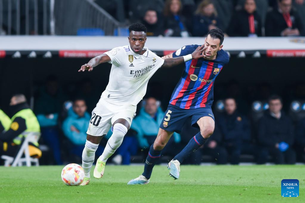 Vinicius Jr. (L) of Real Madrid vies with Sergio Busquets of Barcelona during the Spain's Copa del Rey (King's Cup) semifinal first leg football match between Real Madrid and FC Barcelona in Madrid, Spain, March 2, 2023. (Photo by Gustavo Valiente/Xinhua)