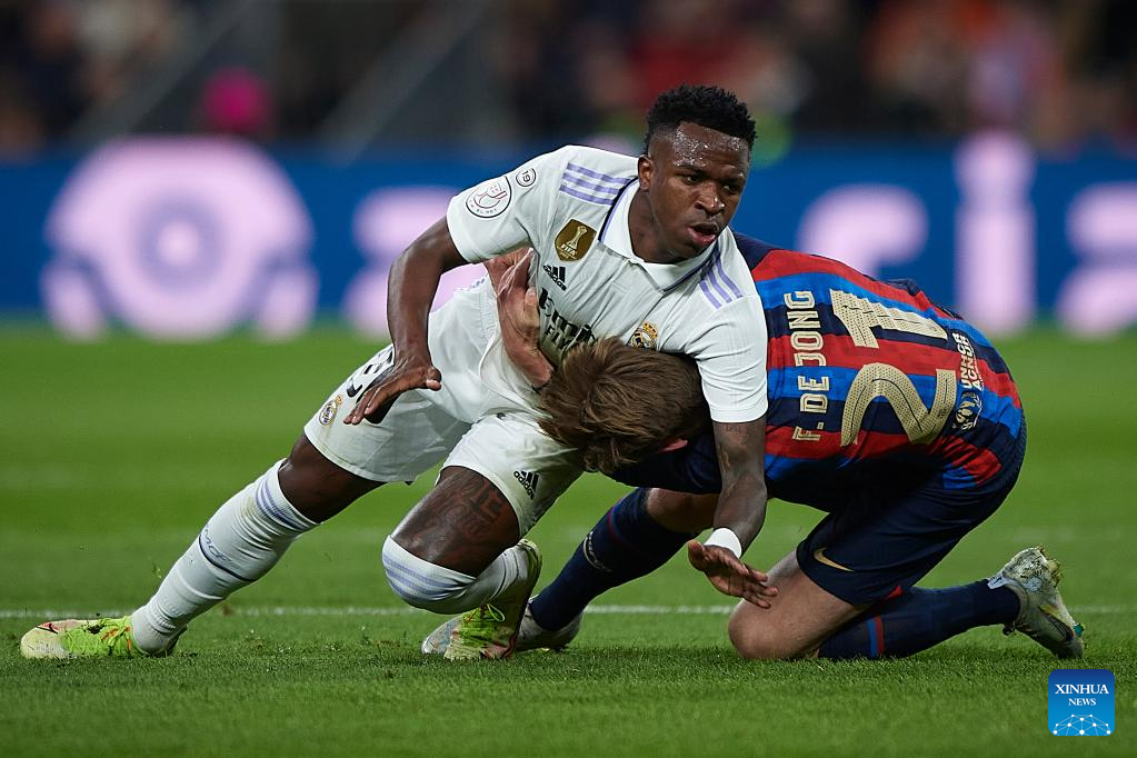 Vinicius Jr. (R) of Real Madrid vies with Frankie de Jong of Barcelona during the Spain's Copa del Rey (King's Cup) semifinal first leg football match between Real Madrid and FC Barcelona in Madrid, Spain, March 2, 2023. (Photo by Pablo Morano/Xinhua)