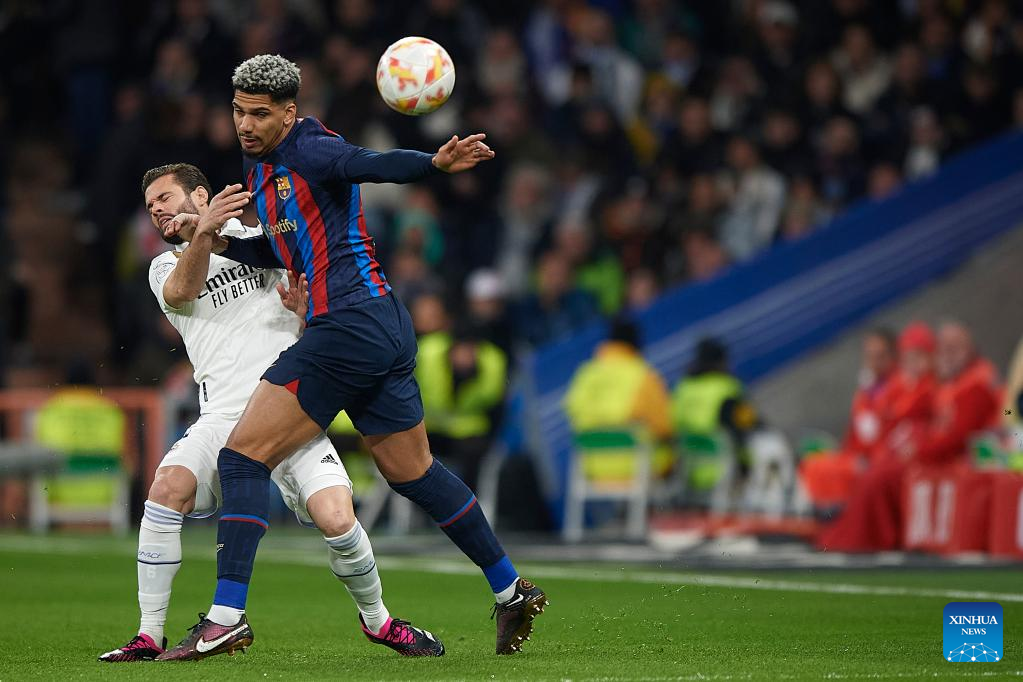 Vinicius Jr. (L) of Real Madrid vies with Ronald Araujo of Barcelona during the Spain's Copa del Rey (King's Cup) semifinal first leg football match between Real Madrid and FC Barcelona in Madrid, Spain, March 2, 2023. (Photo by Pablo Morano/Xinhua)