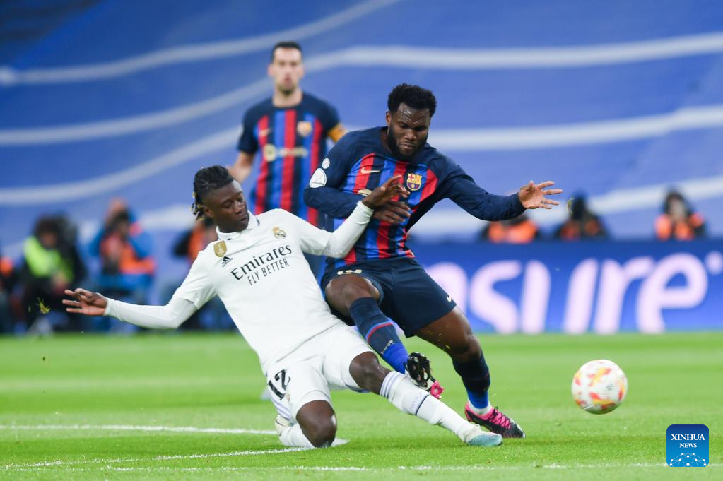 Eduardo Camavinga (L) of Real Madrid vies with Franck Kessie of Barcelona during the Spain's Copa del Rey (King's Cup) semifinal first leg football match between Real Madrid and FC Barcelona in Madrid, Spain, March 2, 2023. (Photo by Gustavo Valiente/Xinhua)