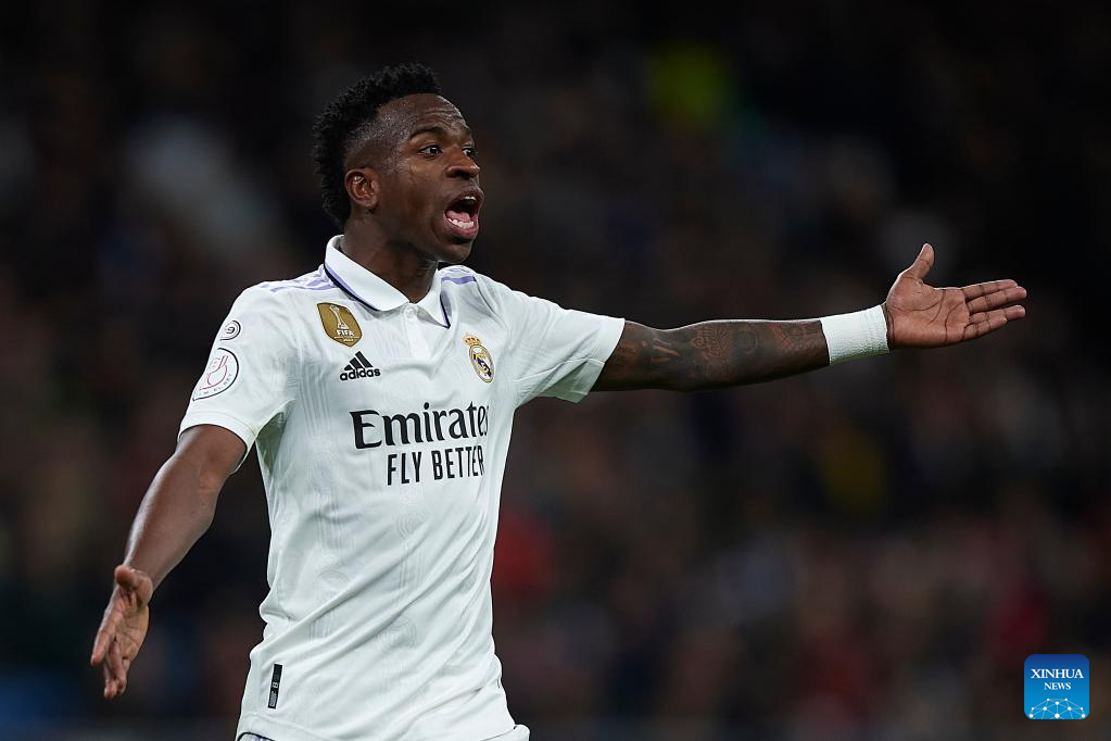Vinicius Jr. of Real Madrid reacts during the Spain's Copa del Rey (King's Cup) semifinal first leg football match between Real Madrid and FC Barcelona in Madrid, Spain, March 2, 2023. (Photo by Pablo Morano/Xinhua)