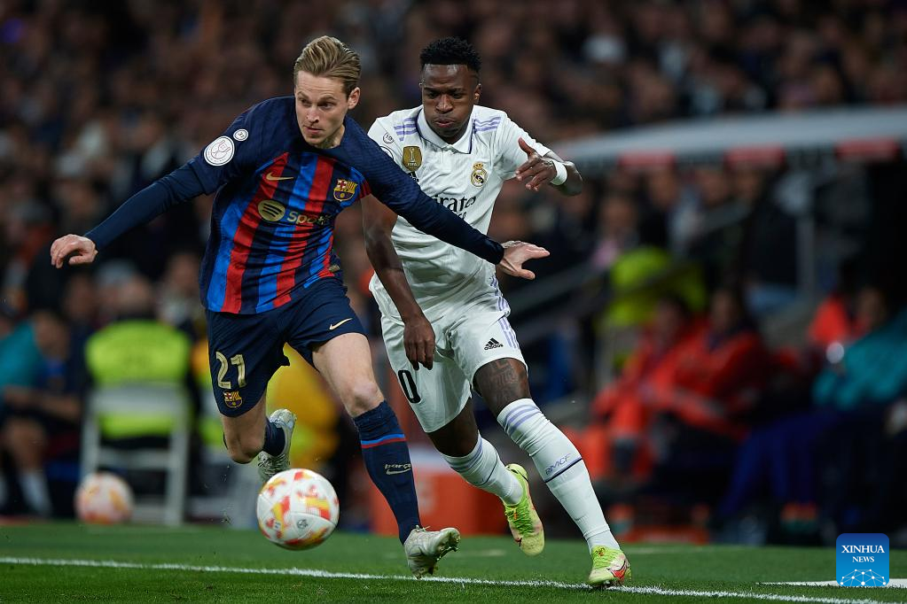 Vinicius Jr. (L) of Real Madrid vies with Frankie de Jong of Barcelona during the Spain's Copa del Rey (King's Cup) semifinal first leg football match between Real Madrid and FC Barcelona in Madrid, Spain, March 2, 2023. (Photo by Pablo Morano/Xinhua)