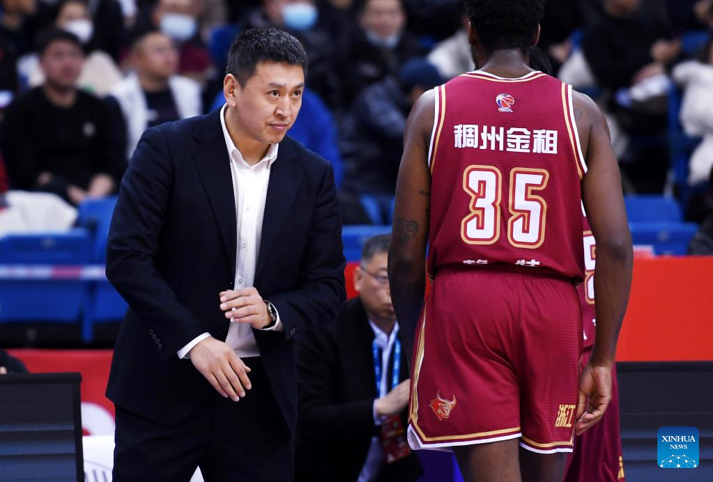 Wang Shilong (L), head coach of Zhejiang Golden bulls, communicates with Moses Wright during the 30th round match between Qingdao Eagles and Zhejiang Golden bulls at the 2022-2023 season of the Chinese Basketball Association (CBA) league in Qingdao, east China's Shandong Province, March 3, 2023. (Xinhua/Li Ziheng)