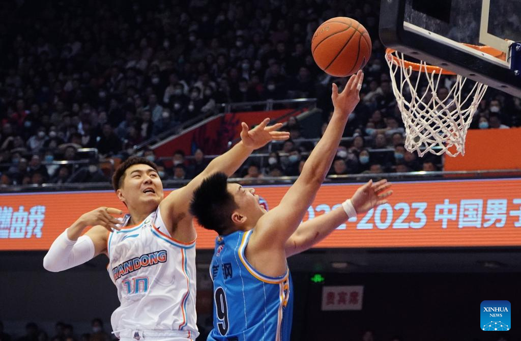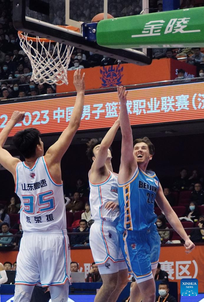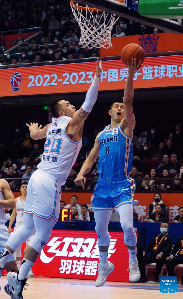 Lei Meng (R) of Beijing Ducks goes for a basket during the 30th round match between Shandong Heroes and Beijing Ducks at the 2022-2023 season of the Chinese Basketball Association (CBA) league in Jinan, capital of east China's Shandong Province, March 3, 2023. (Xinhua/Xu Suhui)