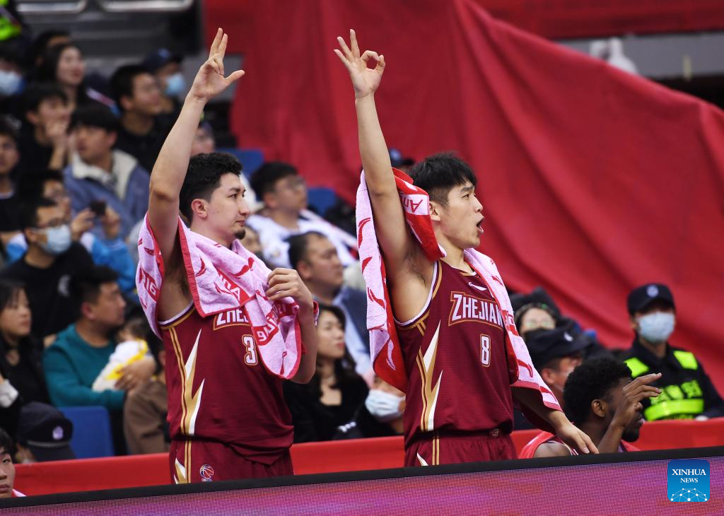 Lu Wenbo (R) of Zhejiang Golden bulls cheer for a goal during the 30th round match between Qingdao Eagles and Zhejiang Golden bulls at the 2022-2023 season of the Chinese Basketball Association (CBA) league in Qingdao, east China's Shandong Province, March 3, 2023. (Xinhua/Li Ziheng)