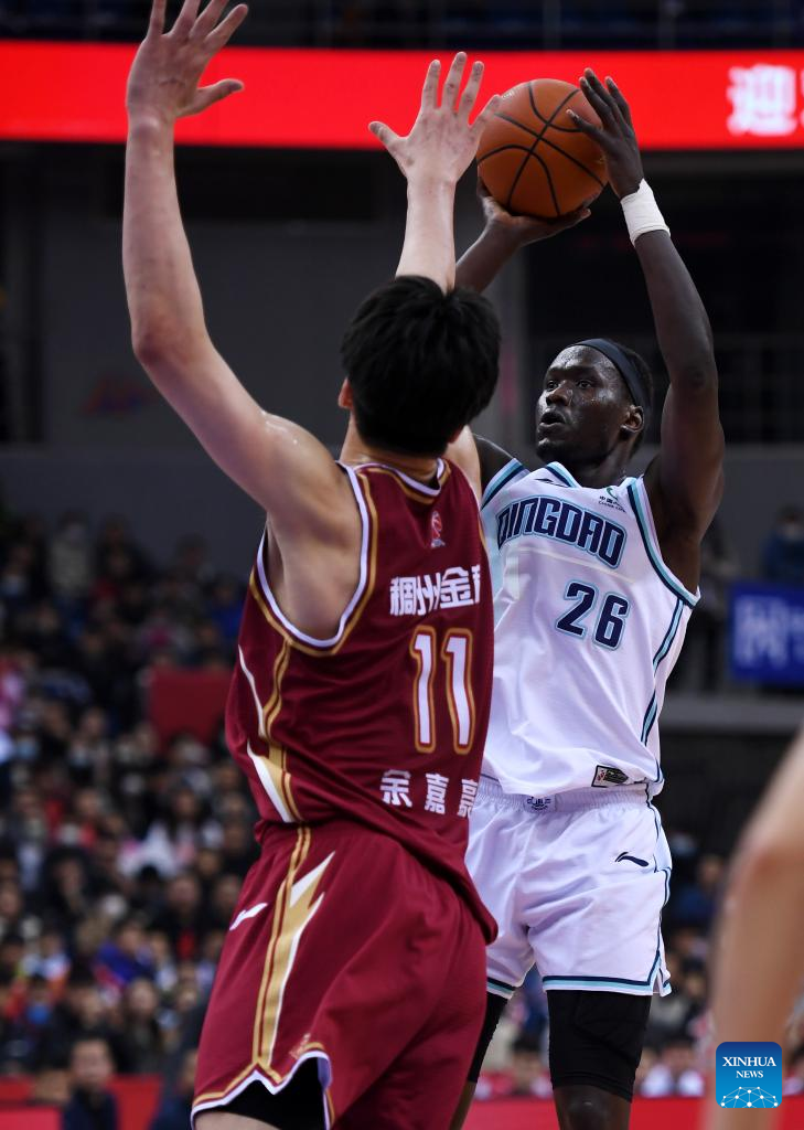 Duop Reath (R) of Qingdao Eagles shoots during the 30th round match between Qingdao Eagles and Zhejiang Golden bulls at the 2022-2023 season of the Chinese Basketball Association (CBA) league in Qingdao, east China's Shandong Province, March 3, 2023. (Xinhua/Li Ziheng)