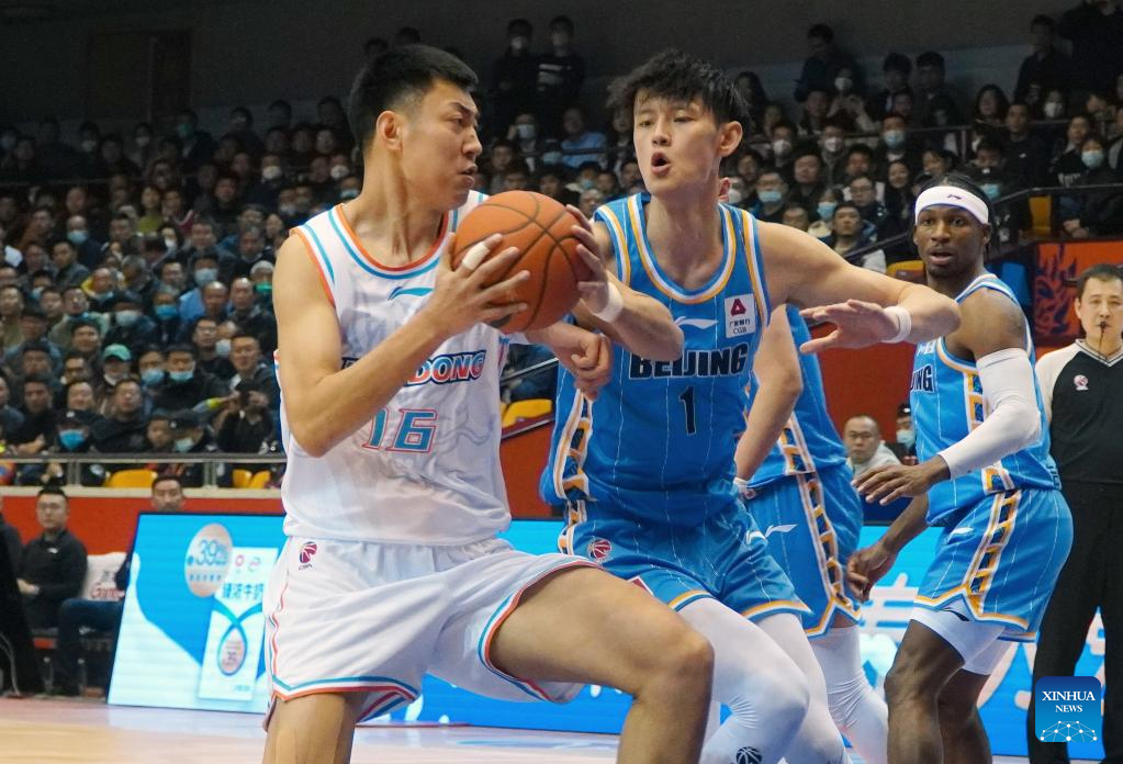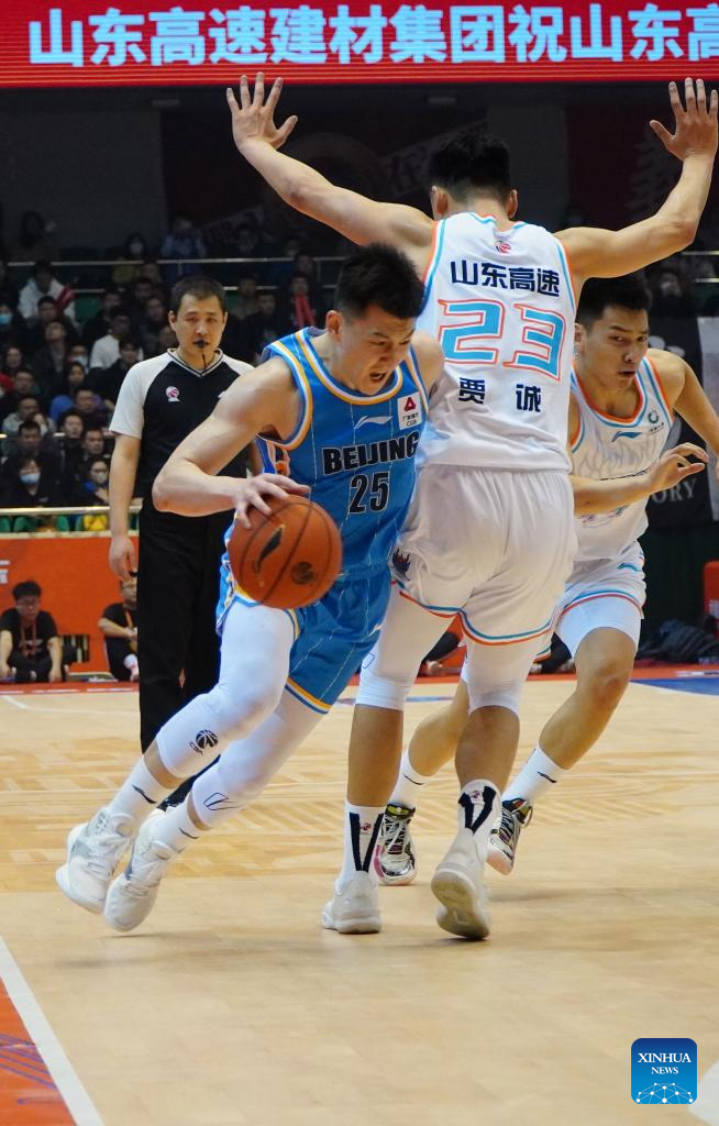 Tian Yuxiang (L) of Beijing Ducks drives the ball during the 30th round match between Shandong Heroes and Beijing Ducks at the 2022-2023 season of the Chinese Basketball Association (CBA) league in Jinan, capital of east China's Shandong Province, March 3, 2023. (Xinhua/Xu Suhui)
