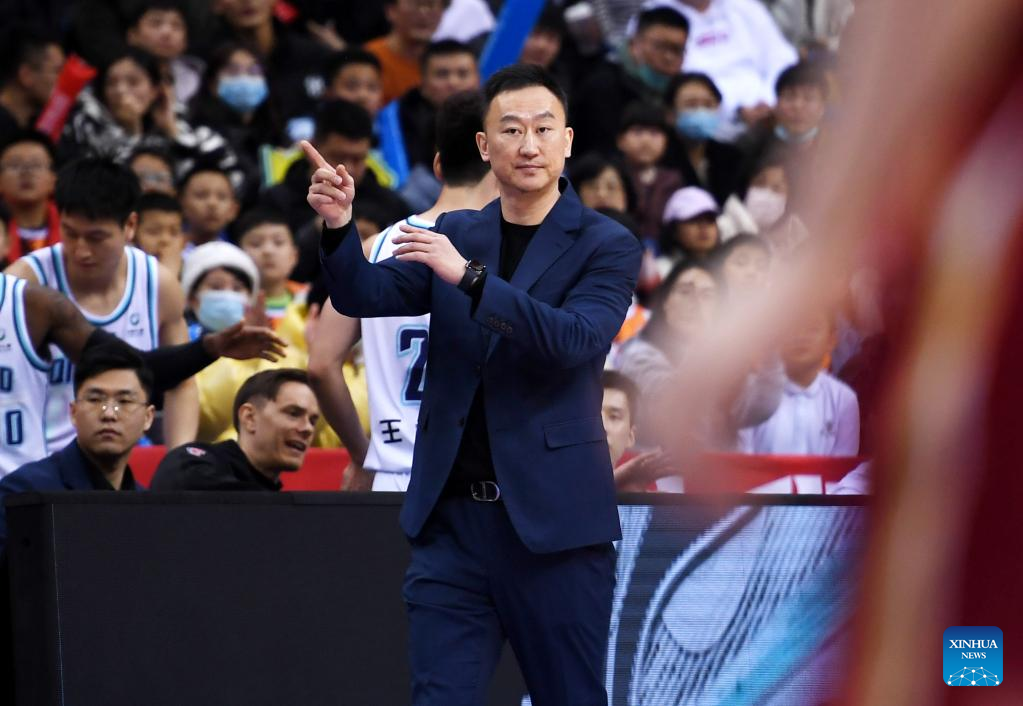 Liu Weiwei, head coach of Qingdao Eagles, gestures during the 30th round match between Qingdao Eagles and Zhejiang Golden bulls at the 2022-2023 season of the Chinese Basketball Association (CBA) league in Qingdao, east China's Shandong Province, March 3, 2023. (Xinhua/Li Ziheng)