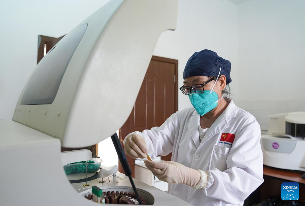 Han Junying, a member of the 21st Chinese medical team dispatched to Djibouti, tests blood samples at the Peltier General Hospital in Djibouti City, Djibouti, Feb. 28, 2023. The 21st Chinese medical team dispatched to Djibouti has been providing medical services at the Peltier General Hospital since January 2022. By the end of February 2023, the medical team had provided 14,658 outpatient services, 576 emergency services and completed 1,168 surgeries. (Xinhua/Han Xu)
