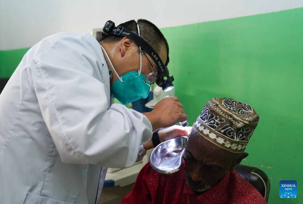 Wang Xufeng, a member of the 21st Chinese medical team dispatched to Djibouti, provides medical treatments for a patient at the Peltier General Hospital in Djibouti City, Djibouti, March 1, 2023. The 21st Chinese medical team dispatched to Djibouti has been providing medical services at the Peltier General Hospital since January 2022. By the end of February 2023, the medical team had provided 14,658 outpatient services, 576 emergency services and completed 1,168 surgeries. (Xinhua/Han Xu)