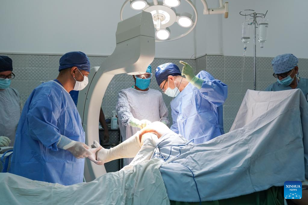 Zhao Peng (2nd R) and Zhang Shu(2nd L), members of the 21st Chinese medical team dispatched to Djibouti, perform a surgery at the Peltier General Hospital in Djibouti City, Djibouti, March 1, 2023. The 21st Chinese medical team dispatched to Djibouti has been providing medical services at the Peltier General Hospital since January 2022. By the end of February 2023, the medical team had provided 14,658 outpatient services, 576 emergency services and completed 1,168 surgeries. (Xinhua/Han Xu)