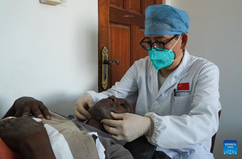 Hou Wei, a member of the 21st Chinese medical team dispatched to Djibouti, provides medical treatments for a patient at the Peltier General Hospital in Djibouti City, Djibouti, March 1, 2023. The 21st Chinese medical team dispatched to Djibouti has been providing medical services at the Peltier General Hospital since January 2022. By the end of February 2023, the medical team had provided 14,658 outpatient services, 576 emergency services and completed 1,168 surgeries. (Xinhua/Han Xu)