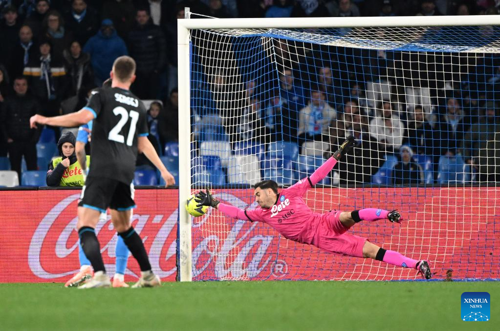 Napoli's goalkeeper Alex Meret (R) fails to save the ball during a Serie A football match between Napoli and Lazio in Naples, Italy, March 3, 2023. (Photo by Alberto Lingria/Xinhua)