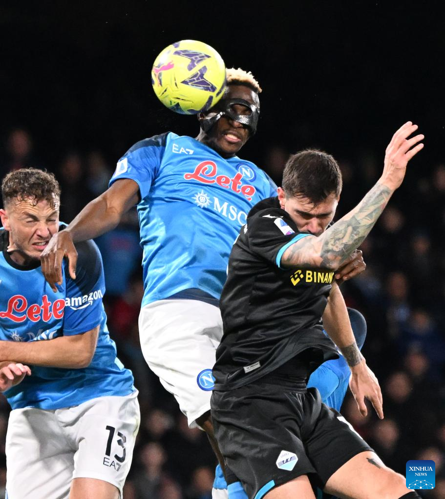 Napoli's Victor Osimhen (C) vies with Lazio's Alessio Romagnoli (R) during a Serie A football match between Napoli and Lazio in Naples, Italy, March 3, 2023. (Photo by Alberto Lingria/Xinhua)