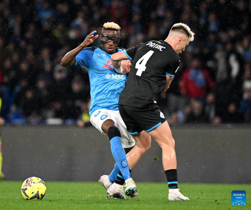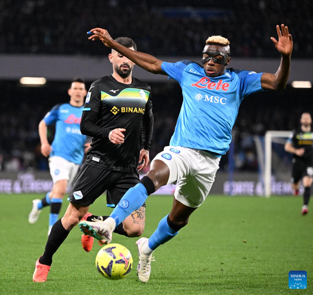 Napoli's Victor Osimhen (R) vies with Lazio's Elseid Hysaj during a Serie A football match between Napoli and Lazio in Naples, Italy, March 3, 2023. (Photo by Alberto Lingria/Xinhua)